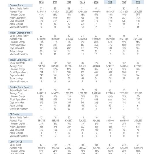 We are off to a strong start in 2022 following a robust holiday season and spring break. Crested Butte is a very hot area for destination seekers and home buyers. Demand for real estate continues to absorb the supply, however properties have been entering the market at a steady pace. It is uncommon for a new listing to receive only one offer.
