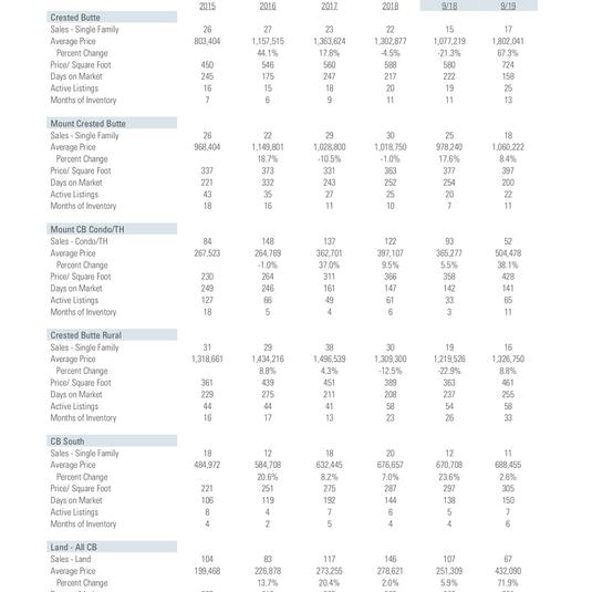 Prices continue to rise in all sectors, even with growing inventory and leveling sales. The average home in Crested Butte is now selling for nearly $725 per square foot. Mountain condominiums are selling for $500,000 on average. A normal lot in the upper valley is now selling for $432,000, a 72% increase over the same period last year.