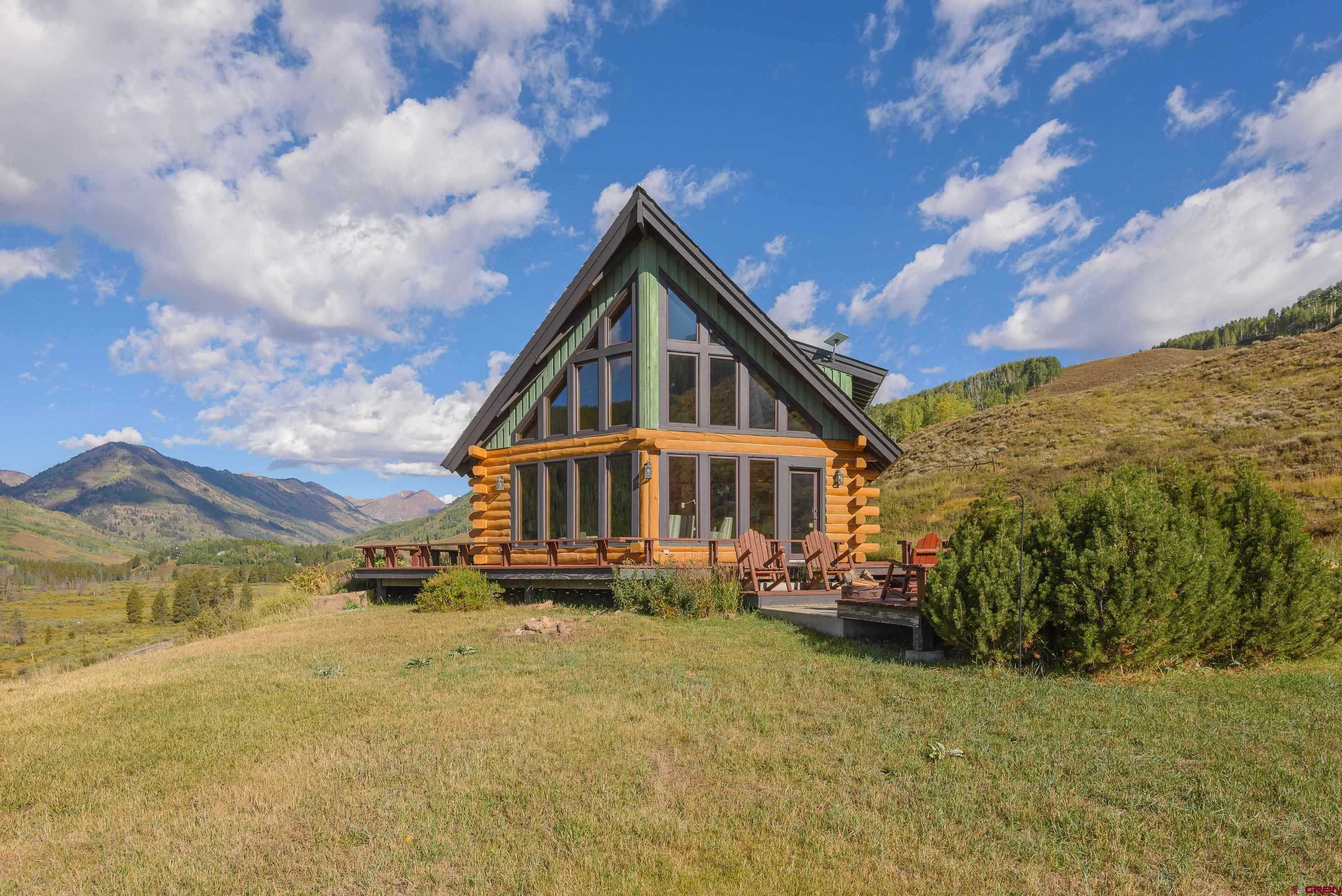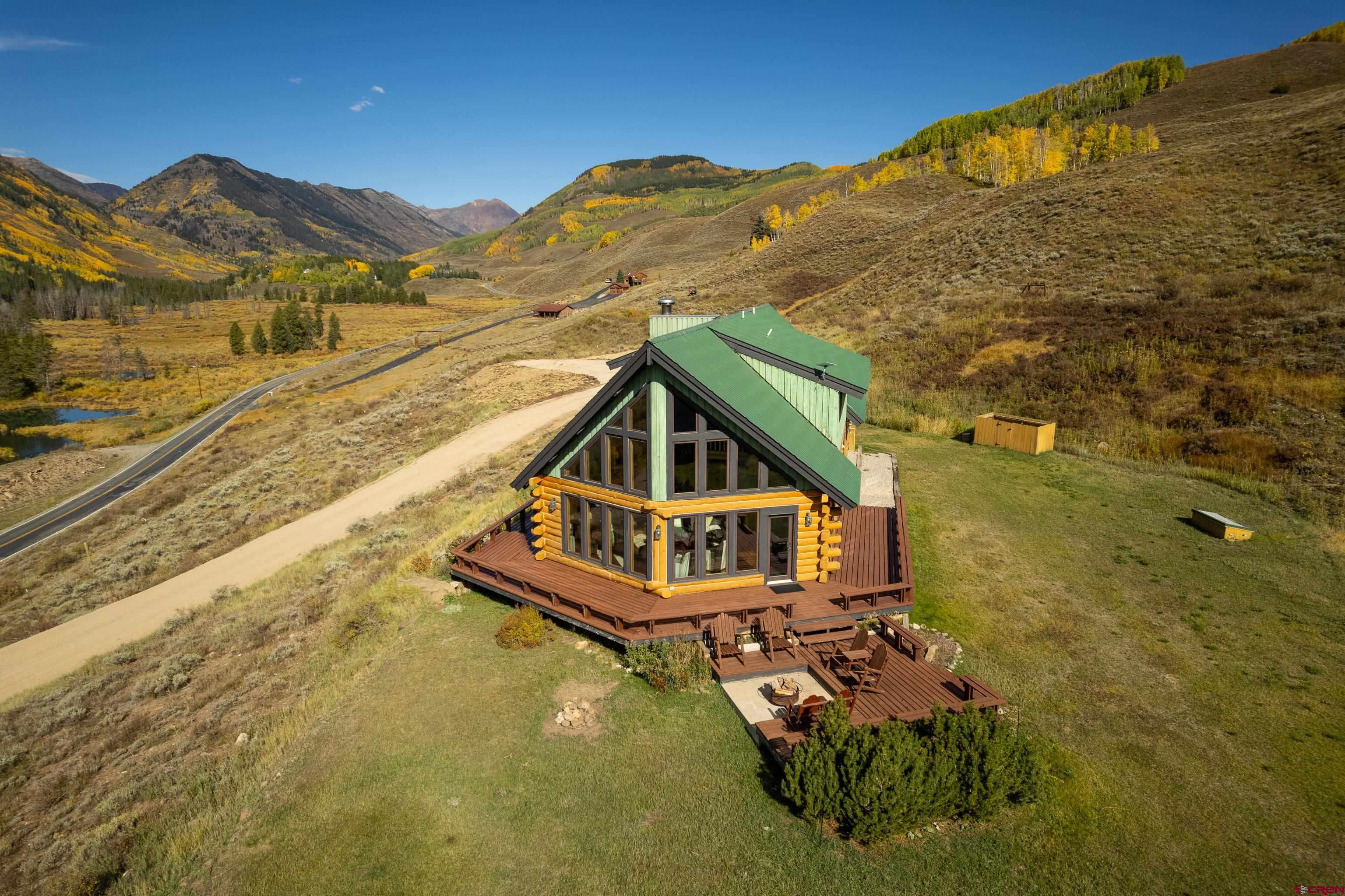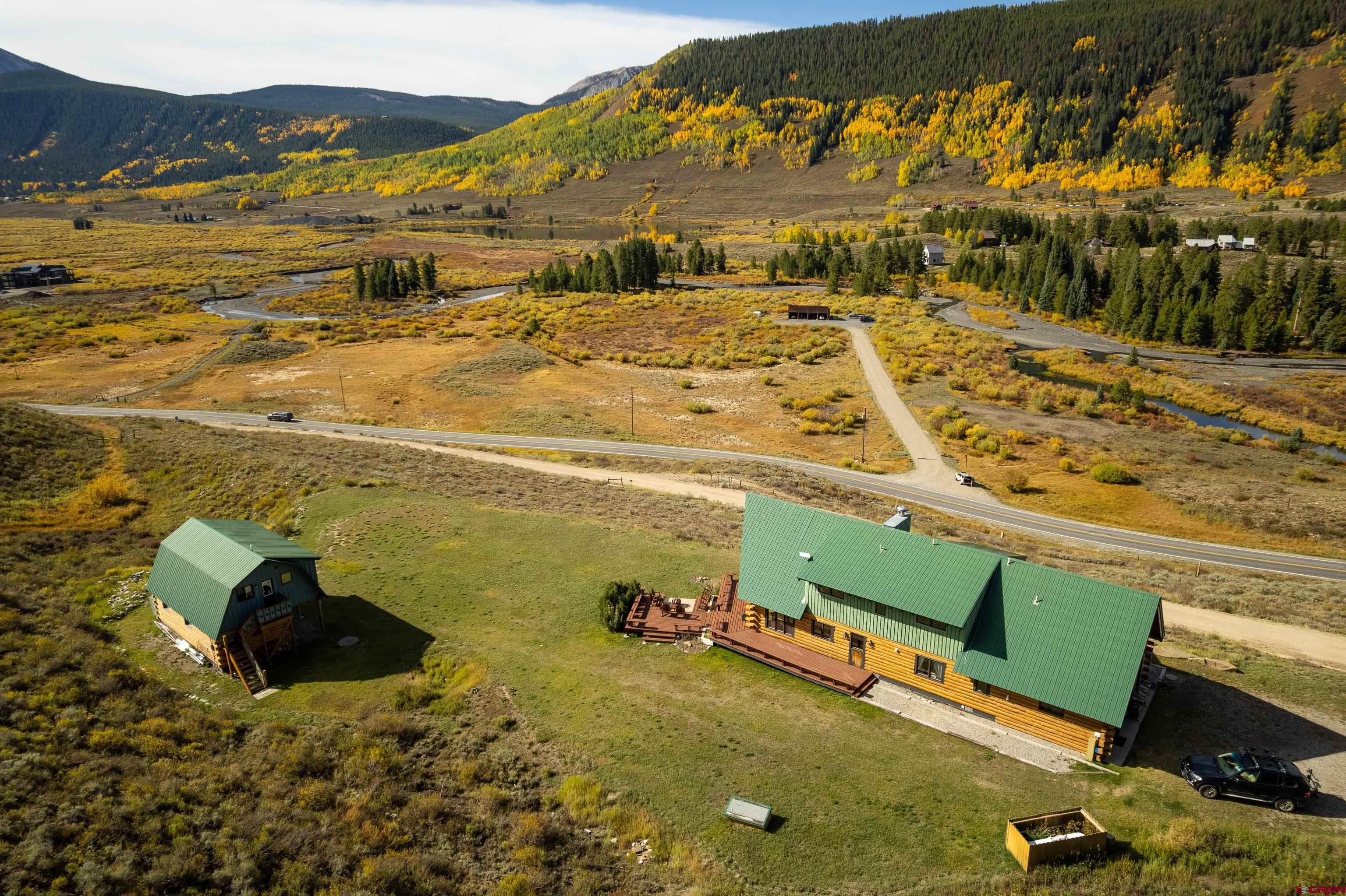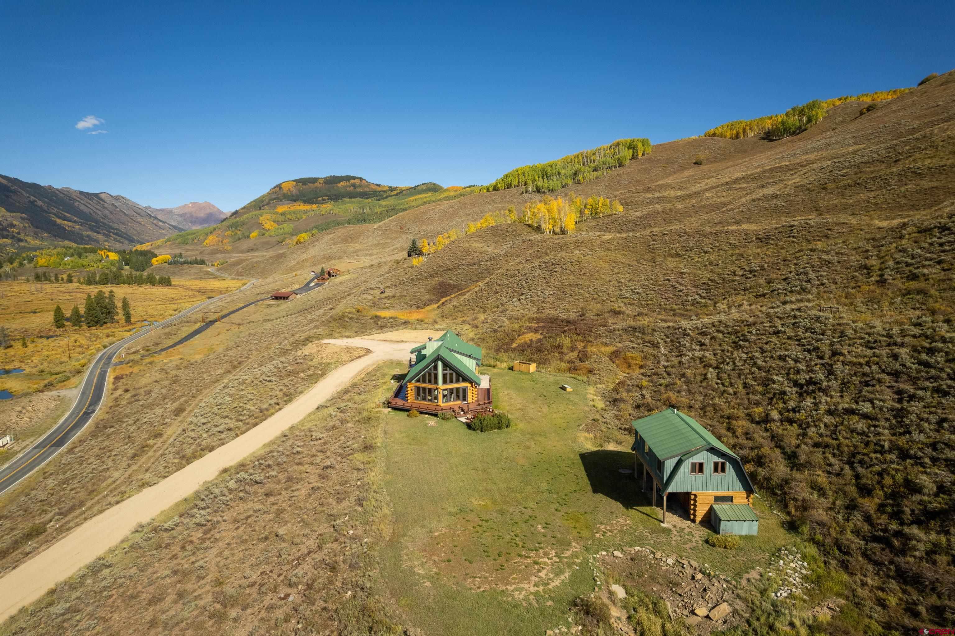 This is a very rare opportunity to own a larger parcel of land with a main residence and an accessory residence with no HOA and stunning views of the entire Crested Butte and Slate River valley. The 10.35 acres hillside setting overlooks open space, Peanut Lake, Mt. Whetstone, Mt. Emmons and the Oh-Be-Joyful recreation area. Enjoy southern and western exposure with windows from the floor to the top of vaulted ceilings for all day sun and beautiful sunsets. The home features 4 bedrooms including a large master suite with a private deck, 3 bathrooms, a game room and a wood burning fireplace as a focal point in the open great room. There is an additional loft space overlooking the living room that has a television. The open kitchen has granite countertops, newer appliances and lots of cabinets and storage. The home is being sold fully furnished excluding the artwork and a few personal items. The 608 square foot Guest house is a comfortable private space with a full kitchen, living area and includes 1 private bedroom and a 3/4 bath. Perfect for overflow guest space, a kids hangout are or even used for an on site caretaker. It is located above a clean and organized storage area/shop.There are trails on the property for horseback riding or hiking and very close access to popular mountain biking and hiking trails including Lupine, Gunsight and the Lower Loop. The expansive outdoor space includes a level grassy yard, large deck, and a fire pit all overlooking the meandering Slate River below. All this and only five minutes to the town of Crested Butte or the ski area.