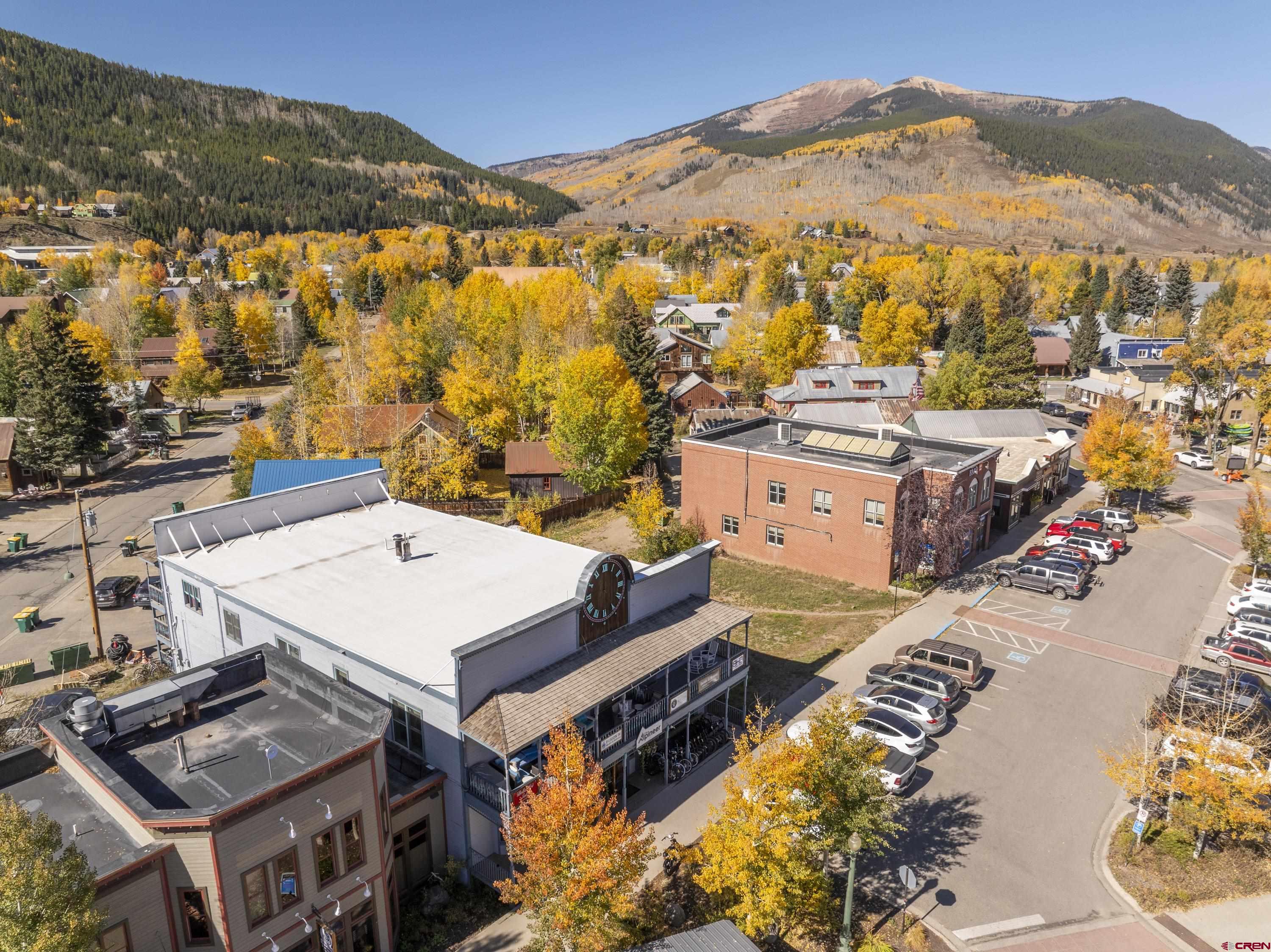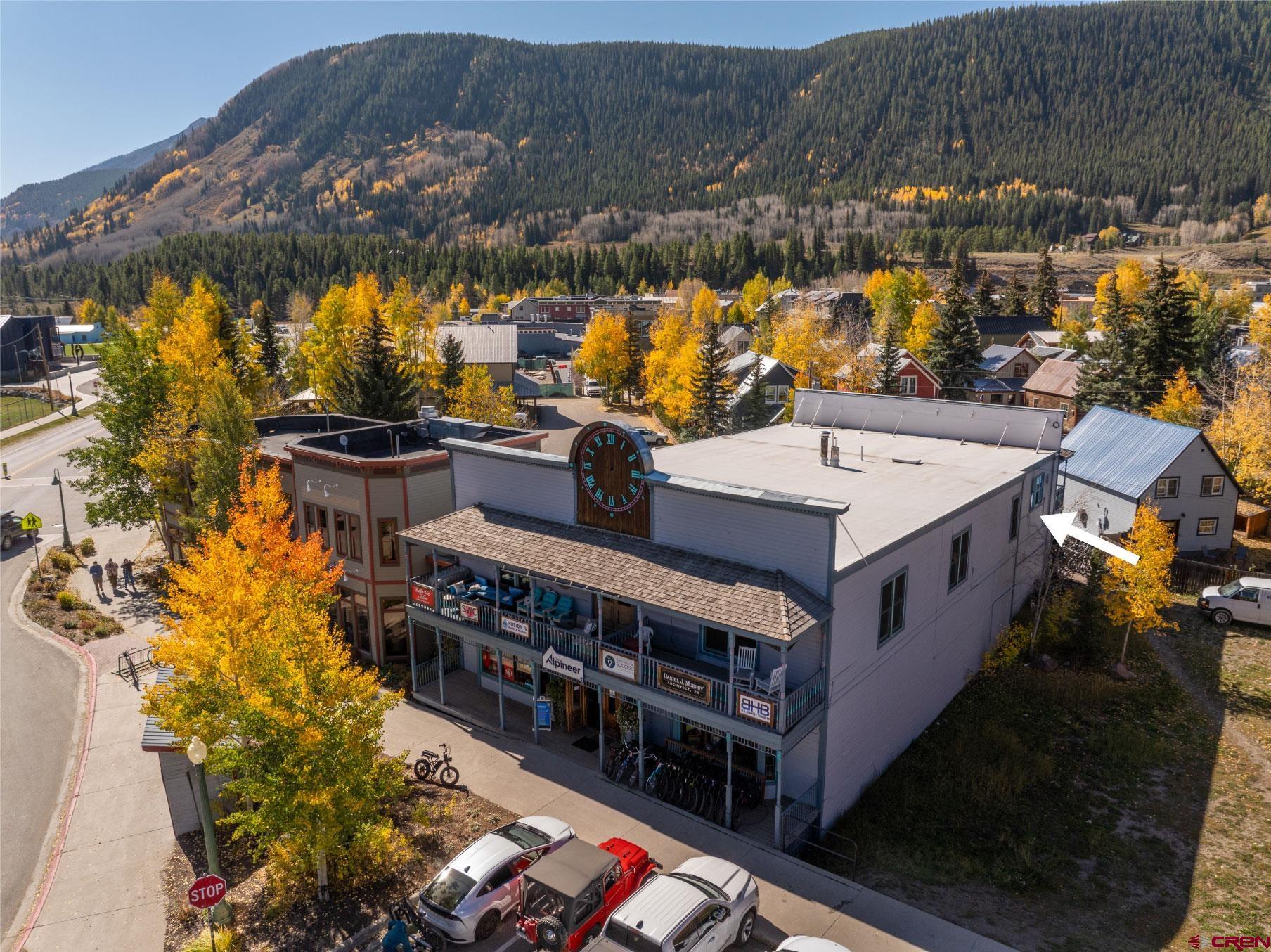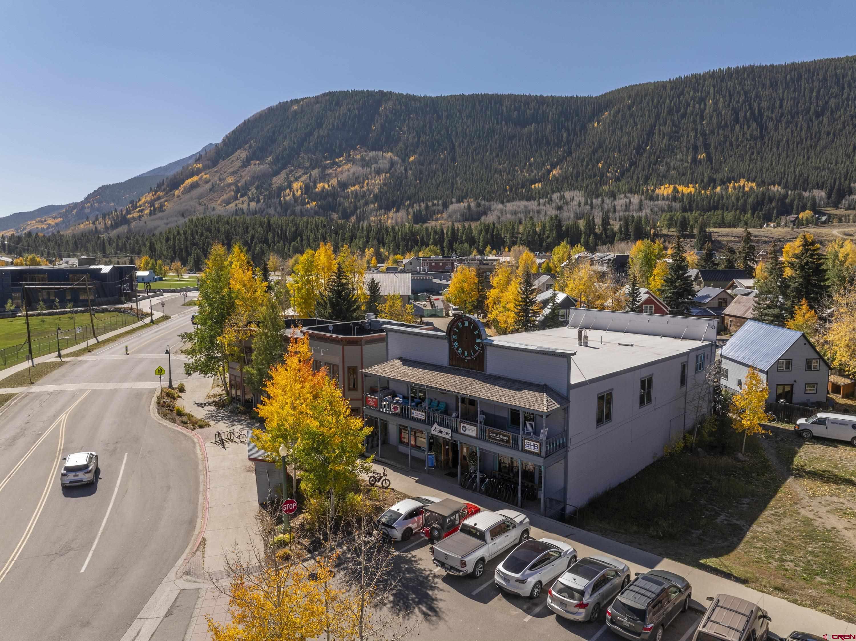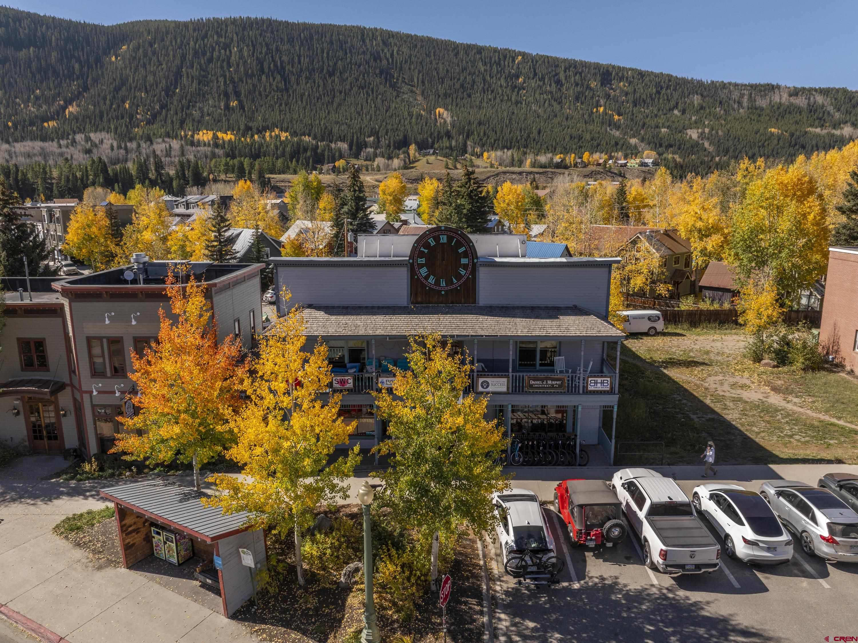 This commercial property features three units in the Bullion King building, located at the bustling 4-way intersection in downtown Crested Butte. With a total of 777 square feet of finished space, the units can be rented individually or combined for a larger office setup. Situated at the prime corner of 6th Street and Elk Avenue, the property offers convenient parking in a shared lot at the front. Access to the second-floor office is available via an interior staircase at the front of the building or an exterior staircase at the back. Shared restrooms is available on second floor. The office space is offered furnished with desks, chairs, and shelving.