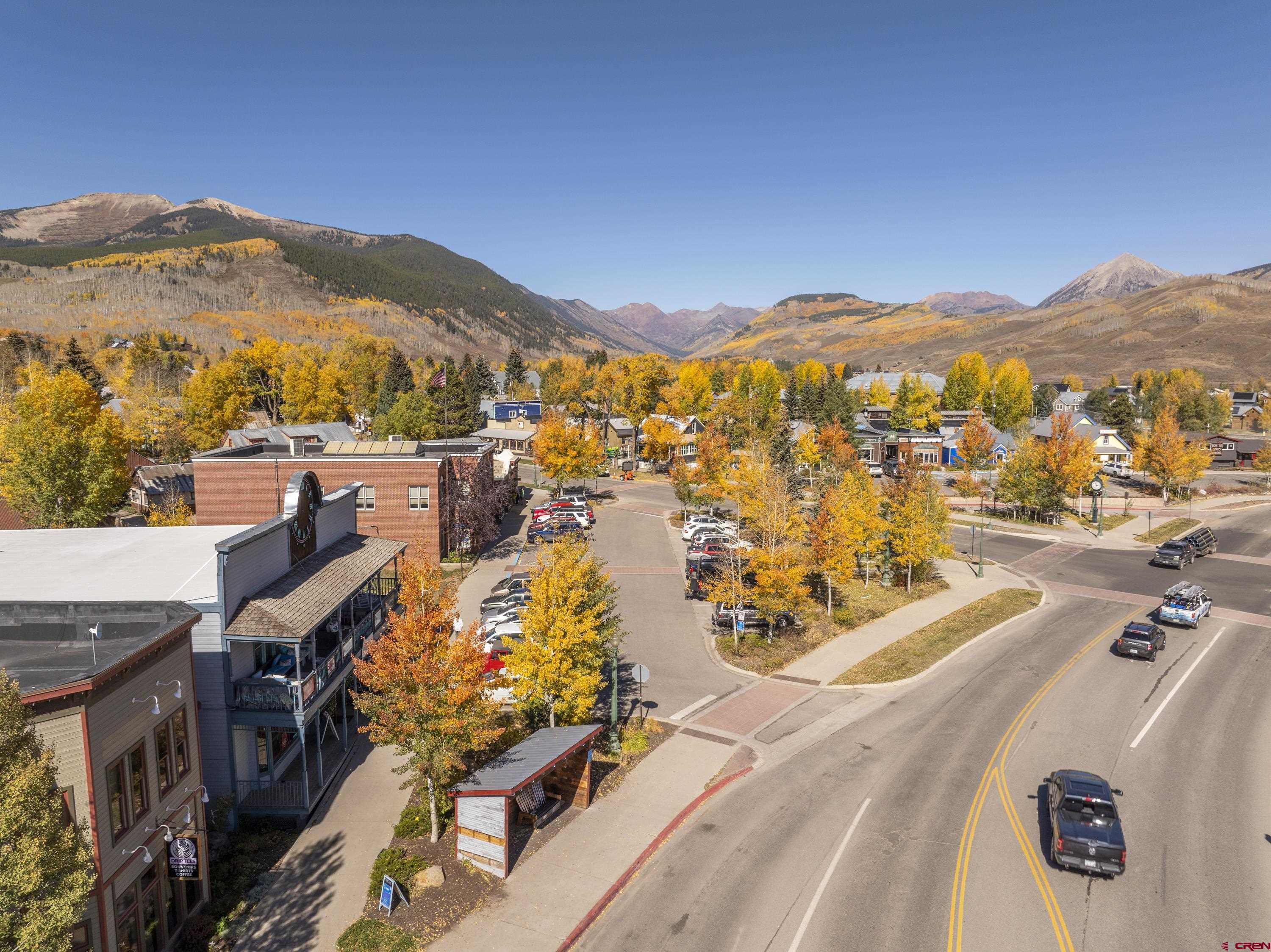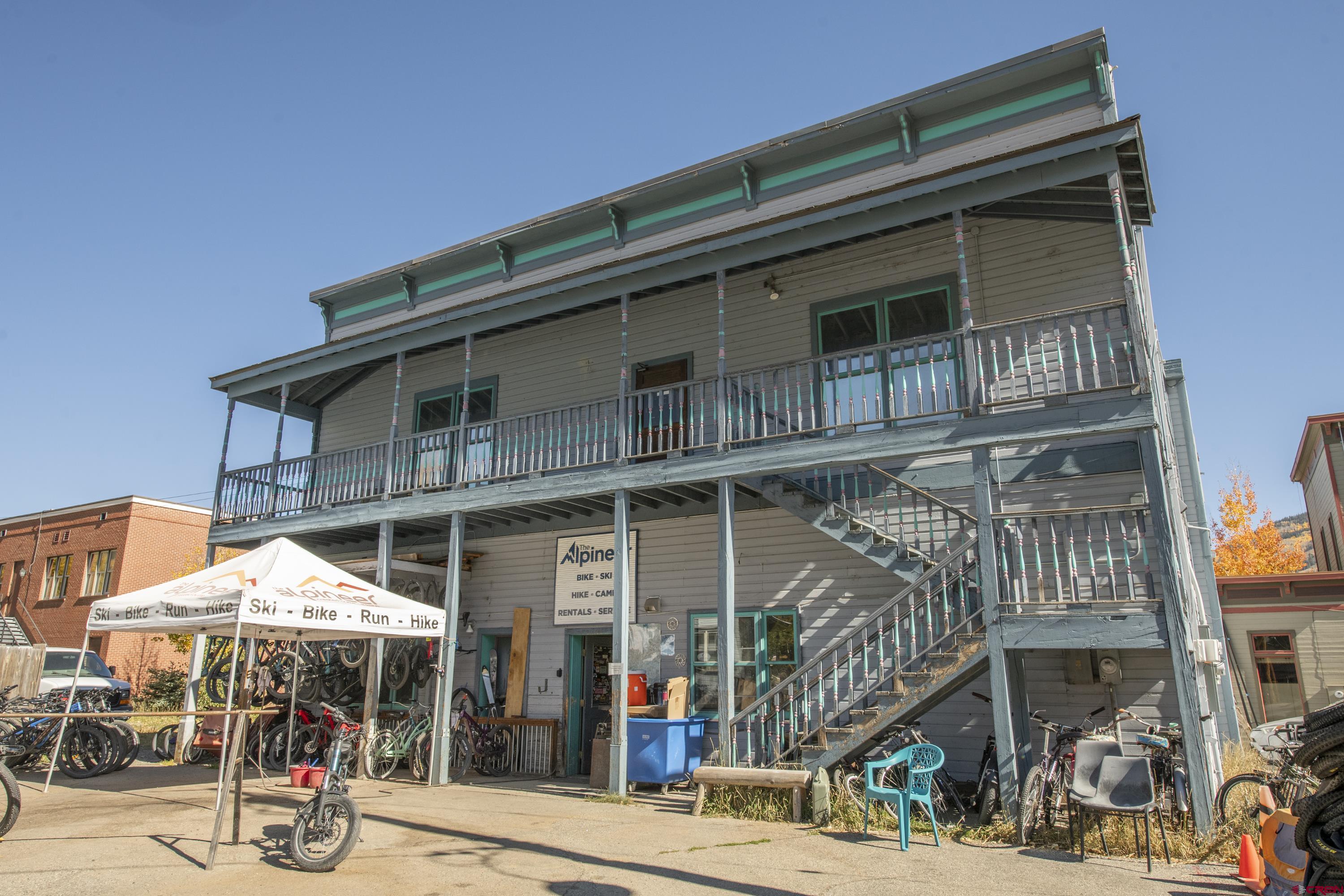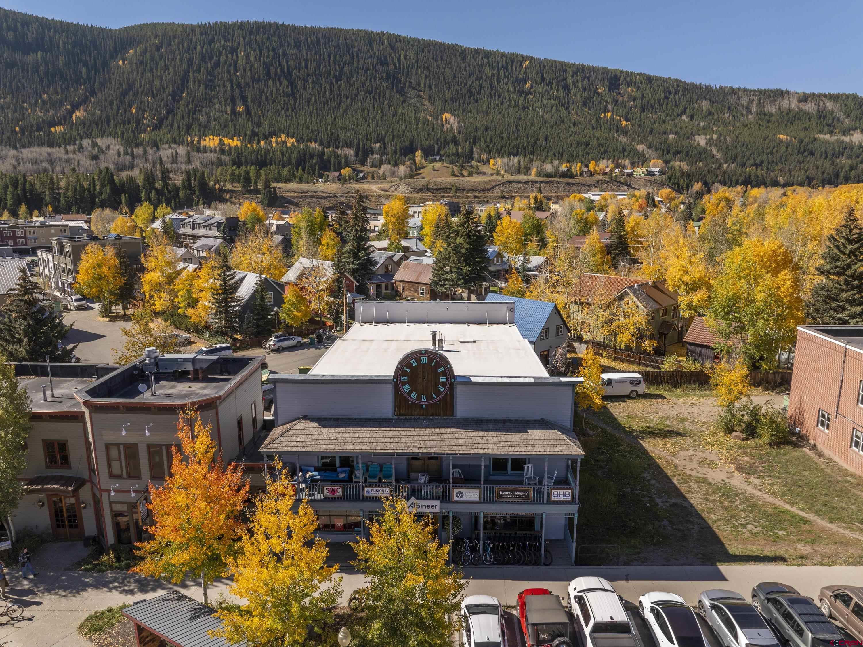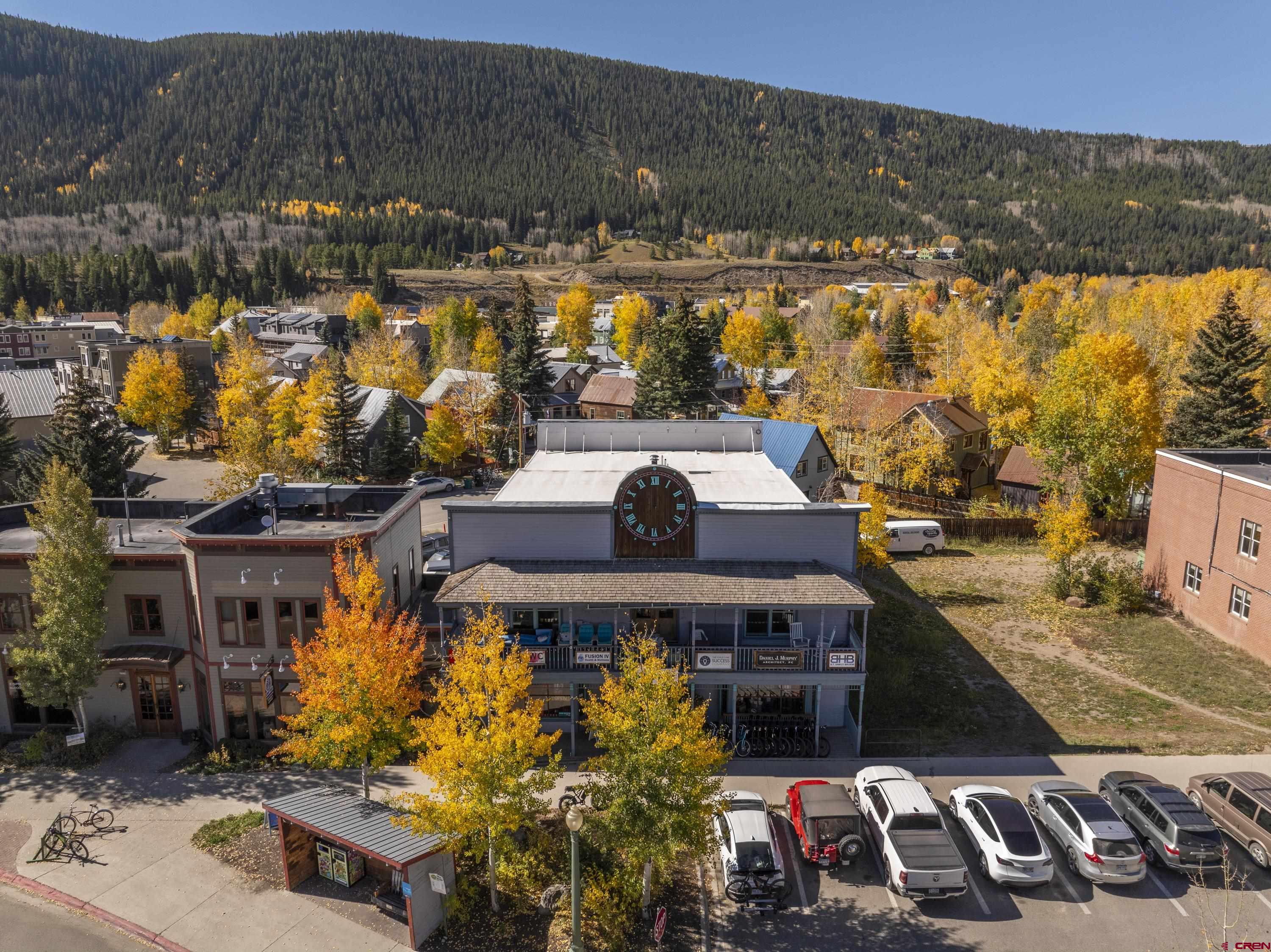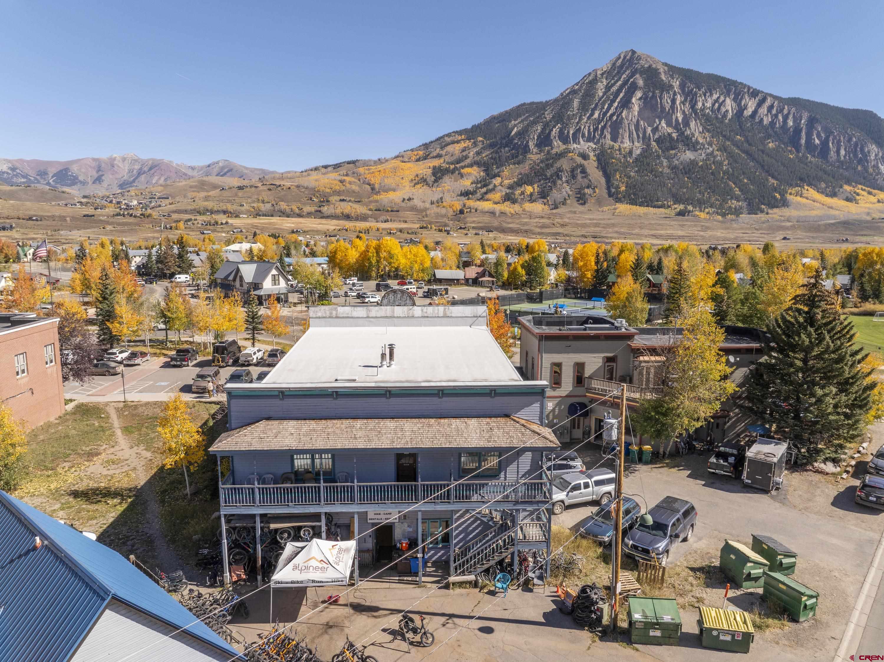 This commercial property features three units in the Bullion King building, located at the bustling 4-way intersection in downtown Crested Butte. With a total of 777 square feet of finished space, the units can be rented individually or combined for a larger office setup. Situated at the prime corner of 6th Street and Elk Avenue, the property offers convenient parking in a shared lot at the front. Access to the second-floor office is available via an interior staircase at the front of the building or an exterior staircase at the back. Shared restrooms is available on second floor. The office space is offered furnished with desks, chairs, and shelving.