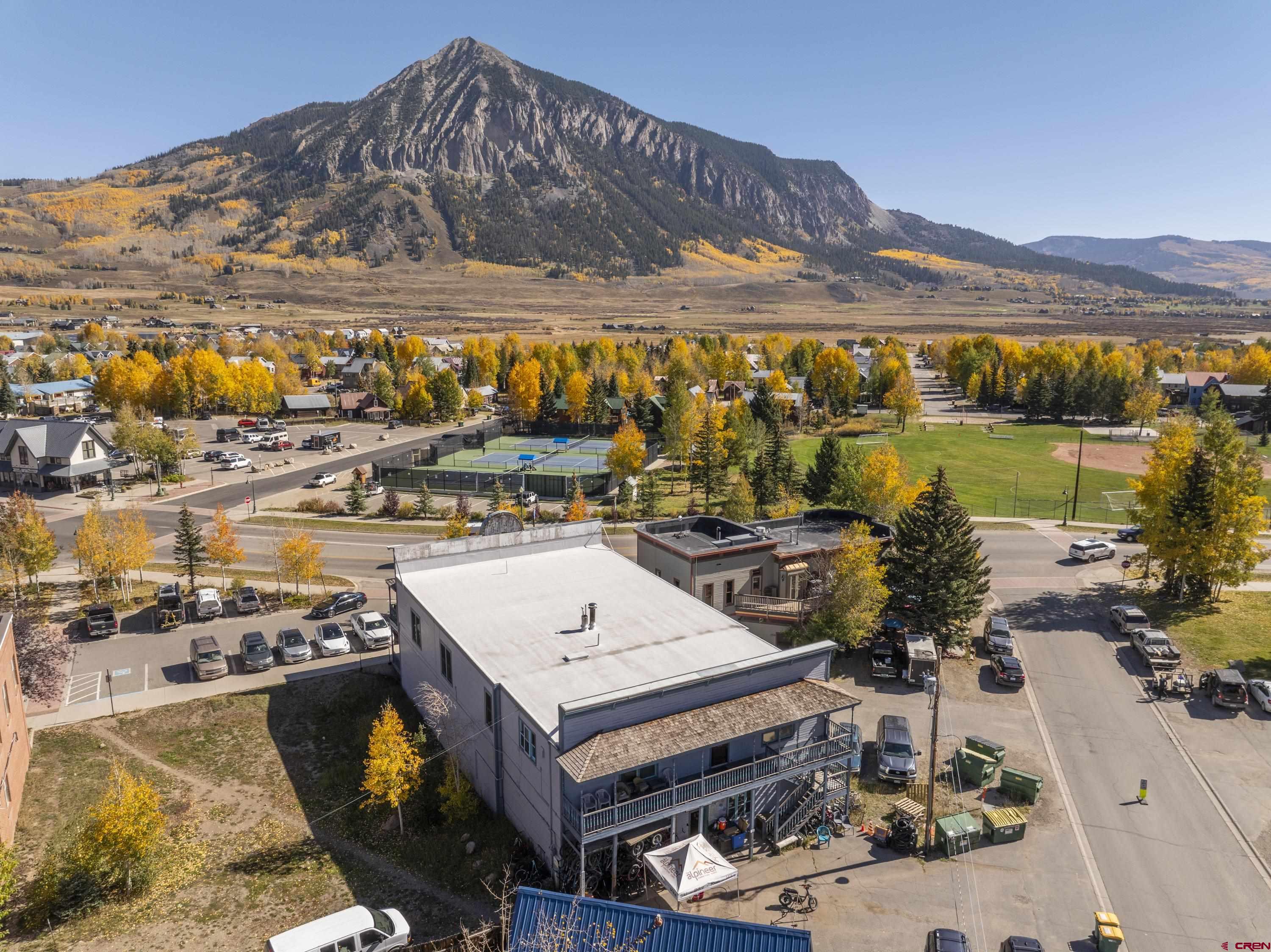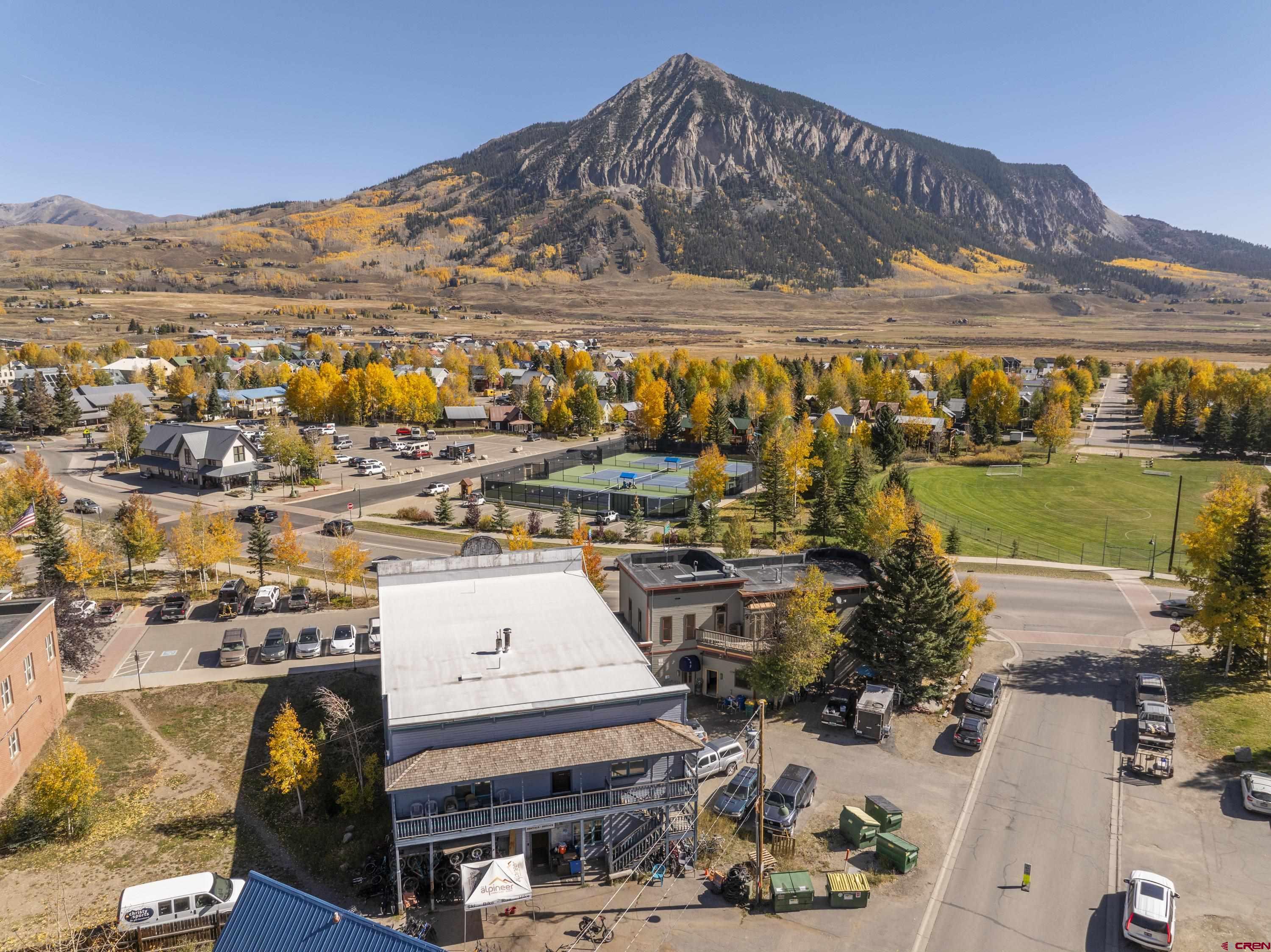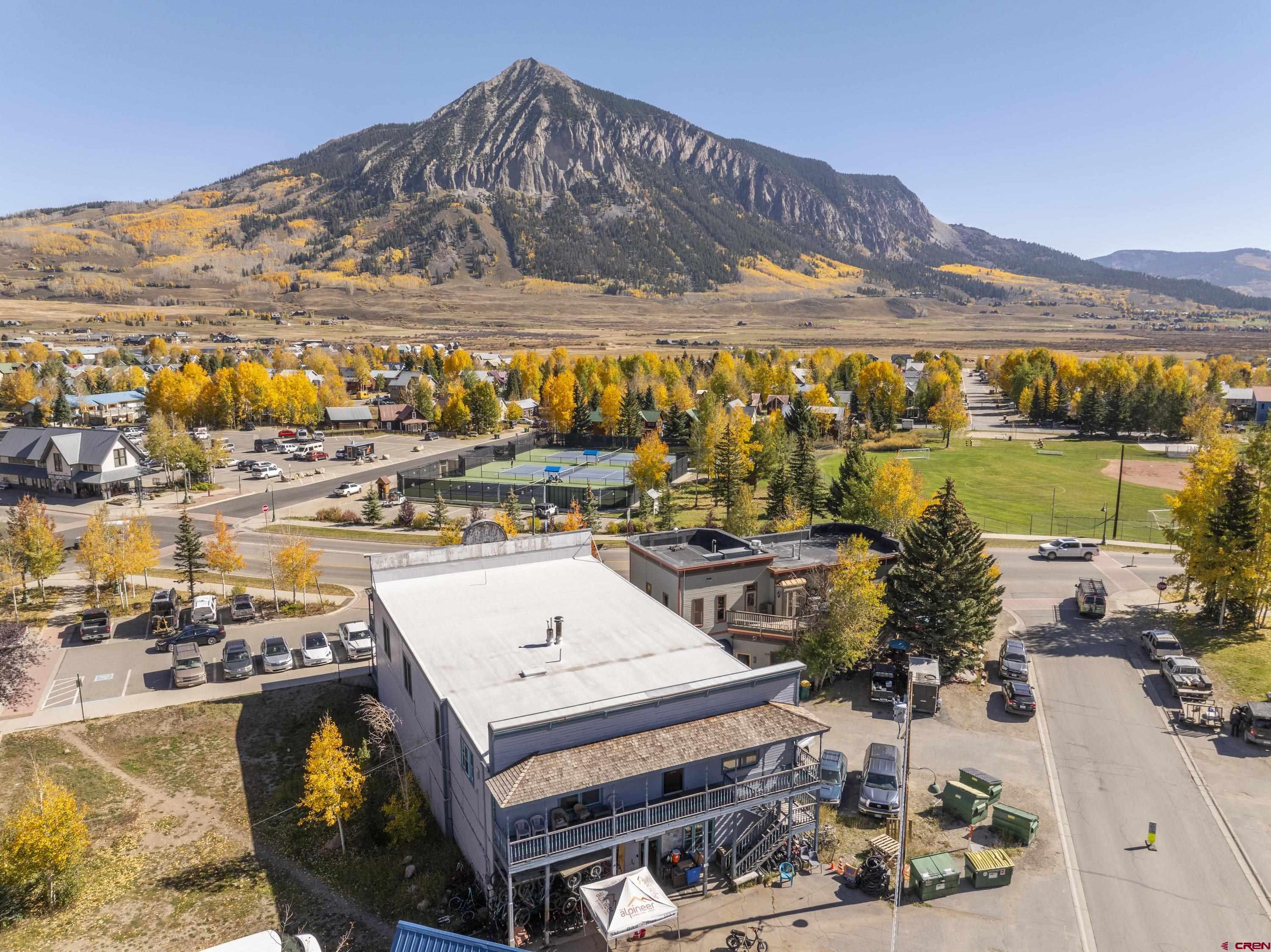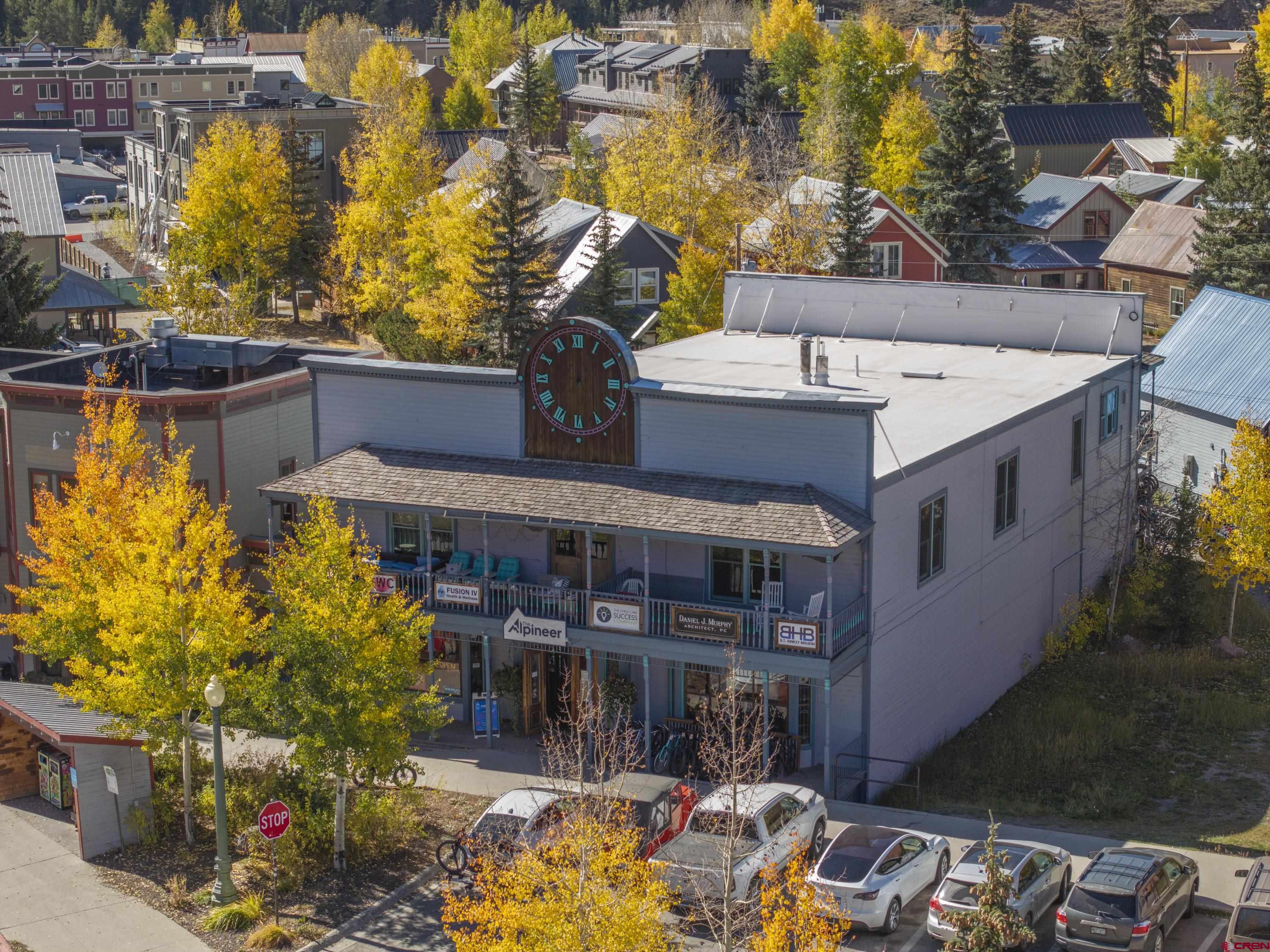 This commercial property features three units in the Bullion King building, located at the bustling 4-way intersection in downtown Crested Butte. With a total of 777 square feet of finished space, the units can be rented individually or combined for a larger office setup. Situated at the prime corner of 6th Street and Elk Avenue, the property offers convenient parking in a shared lot at the front. Access to the second-floor office is available via an interior staircase at the front of the building or an exterior staircase at the back. Shared restrooms is available on second floor. The office space is offered furnished with desks, chairs, and shelving.