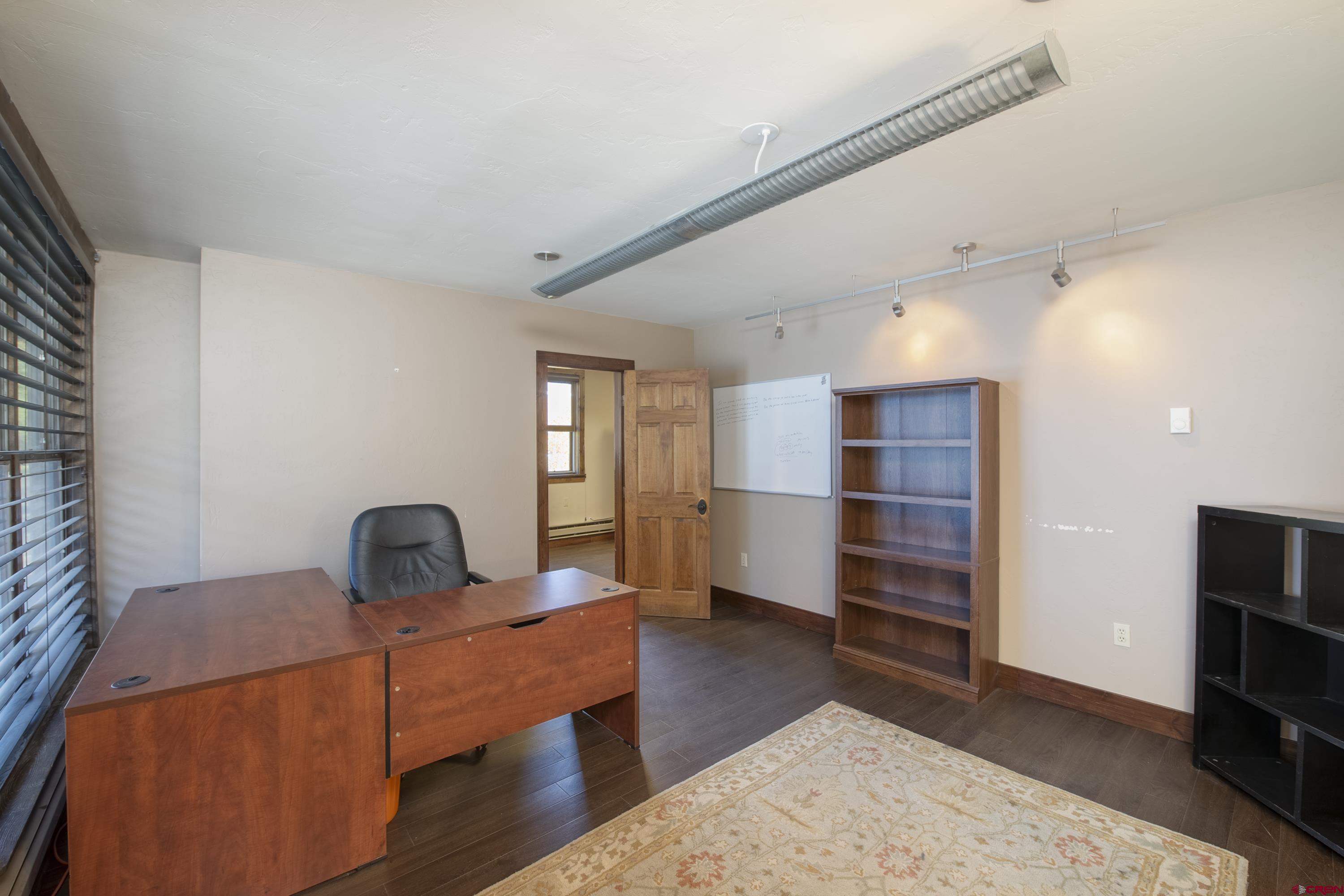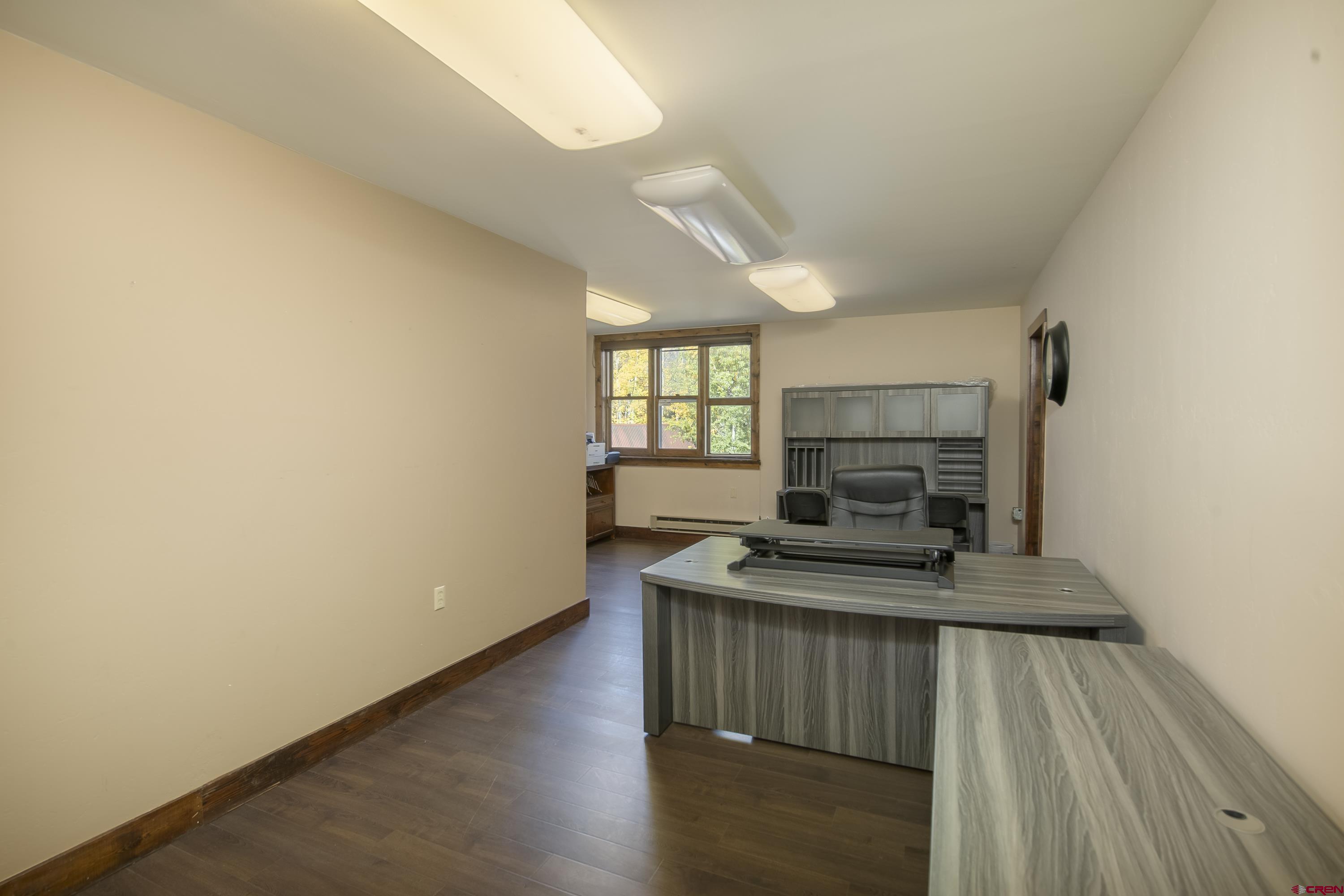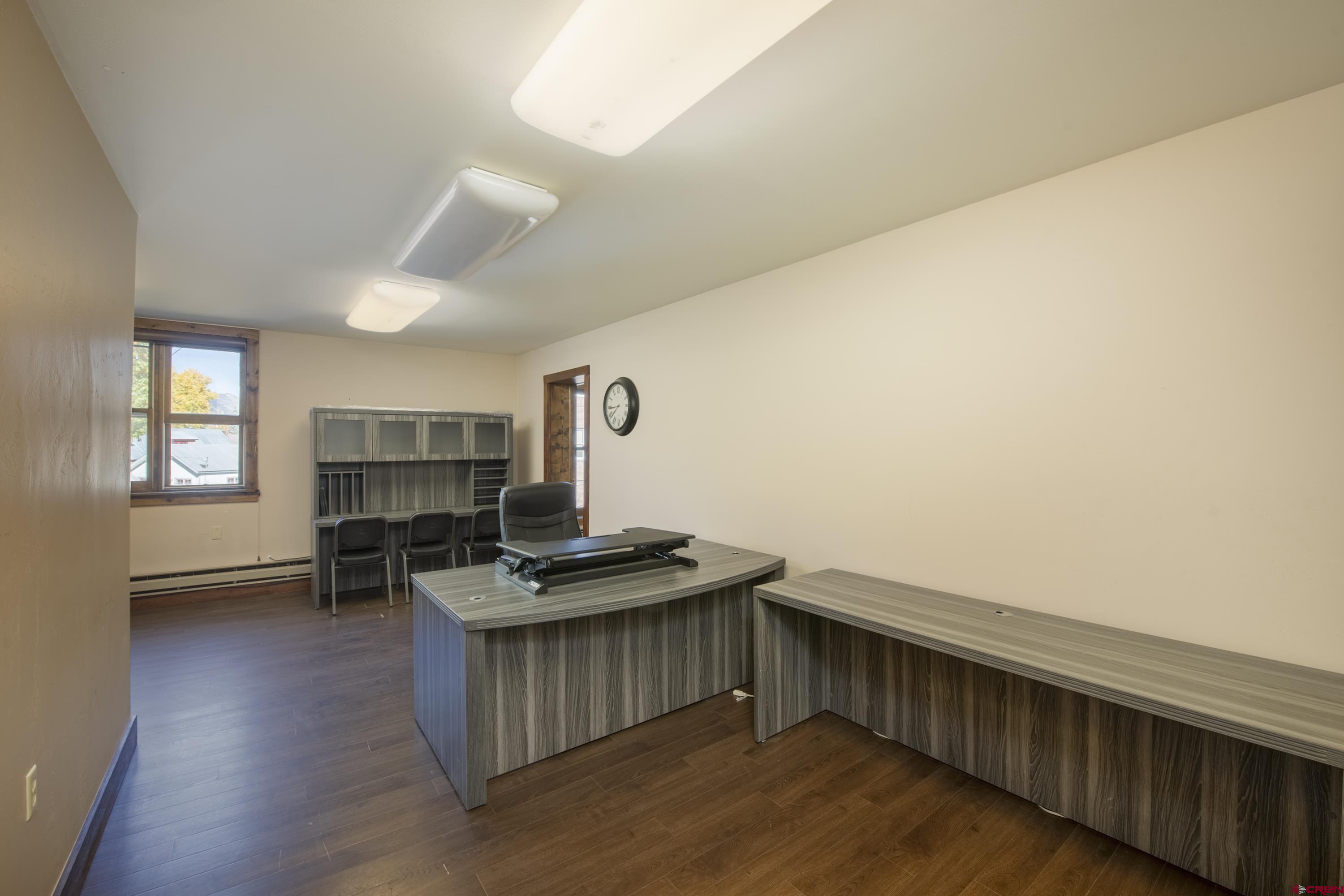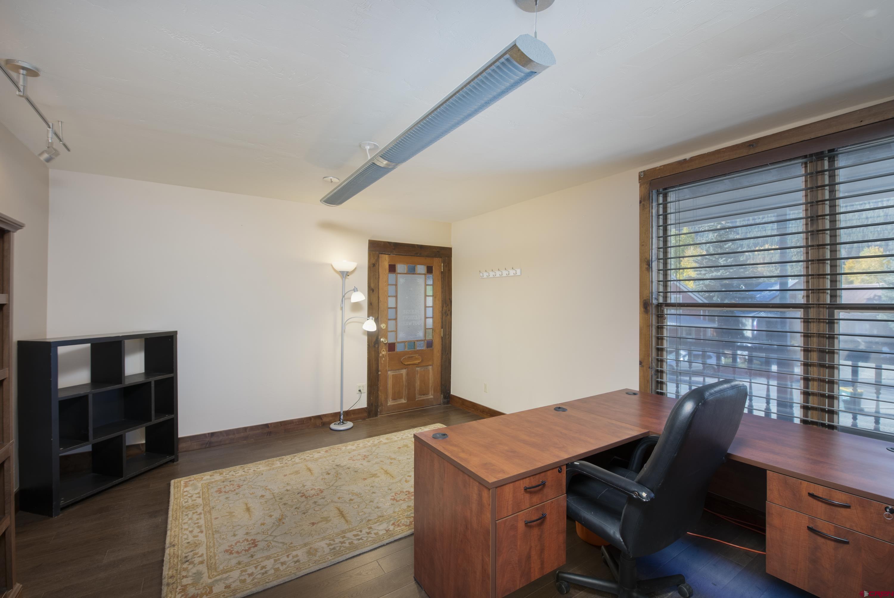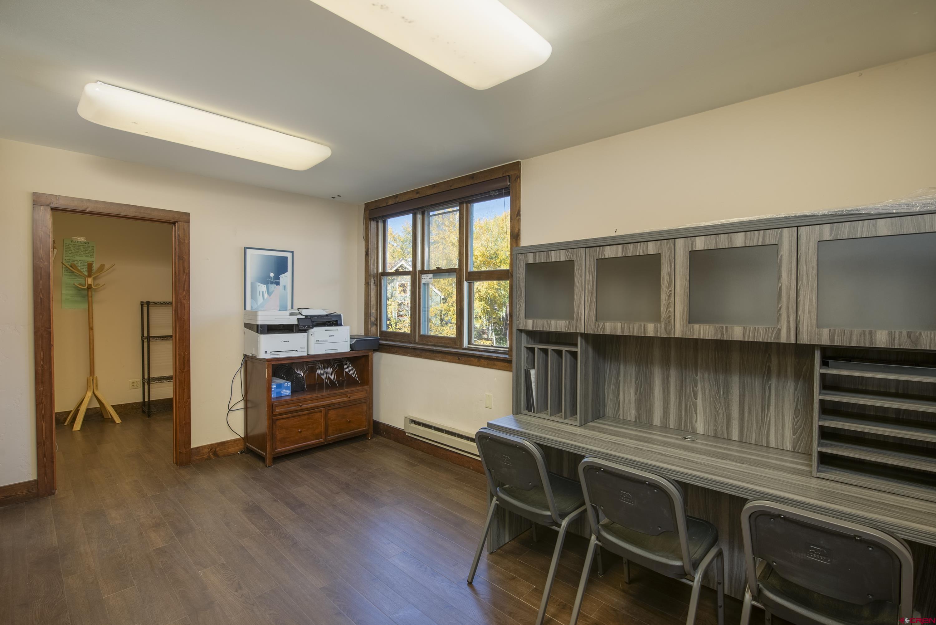This commercial property features three units in the Bullion King building, located at the bustling 4-way intersection in downtown Crested Butte. With a total of 777 square feet of finished space, the units can be rented individually or combined for a larger office setup. Situated at the prime corner of 6th Street and Elk Avenue, the property offers convenient parking in a shared lot at the front. Access to the second-floor office is available via an interior staircase at the front of the building or an exterior staircase at the back. Shared restrooms is available on second floor. The office space is offered furnished with desks, chairs, and shelving.