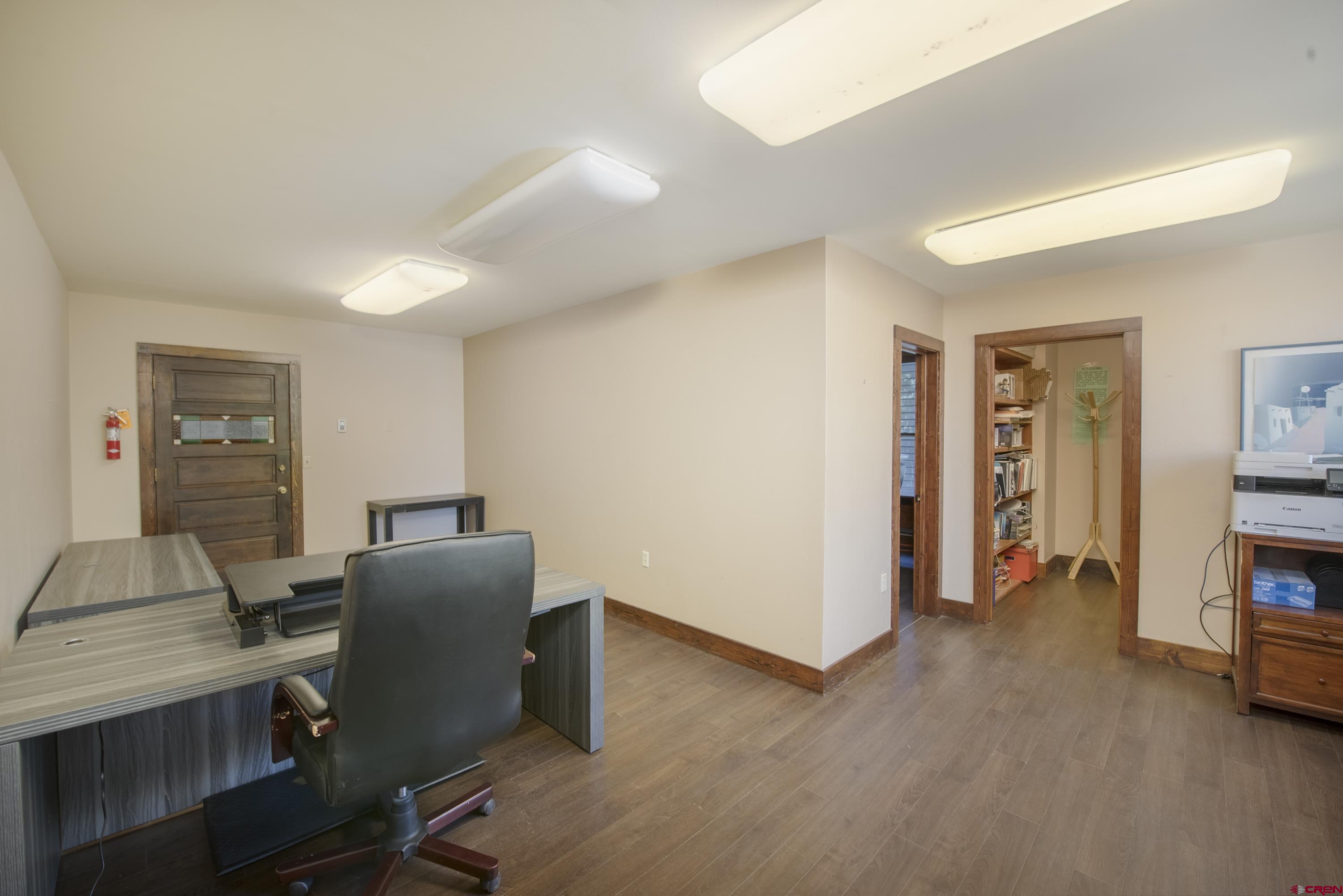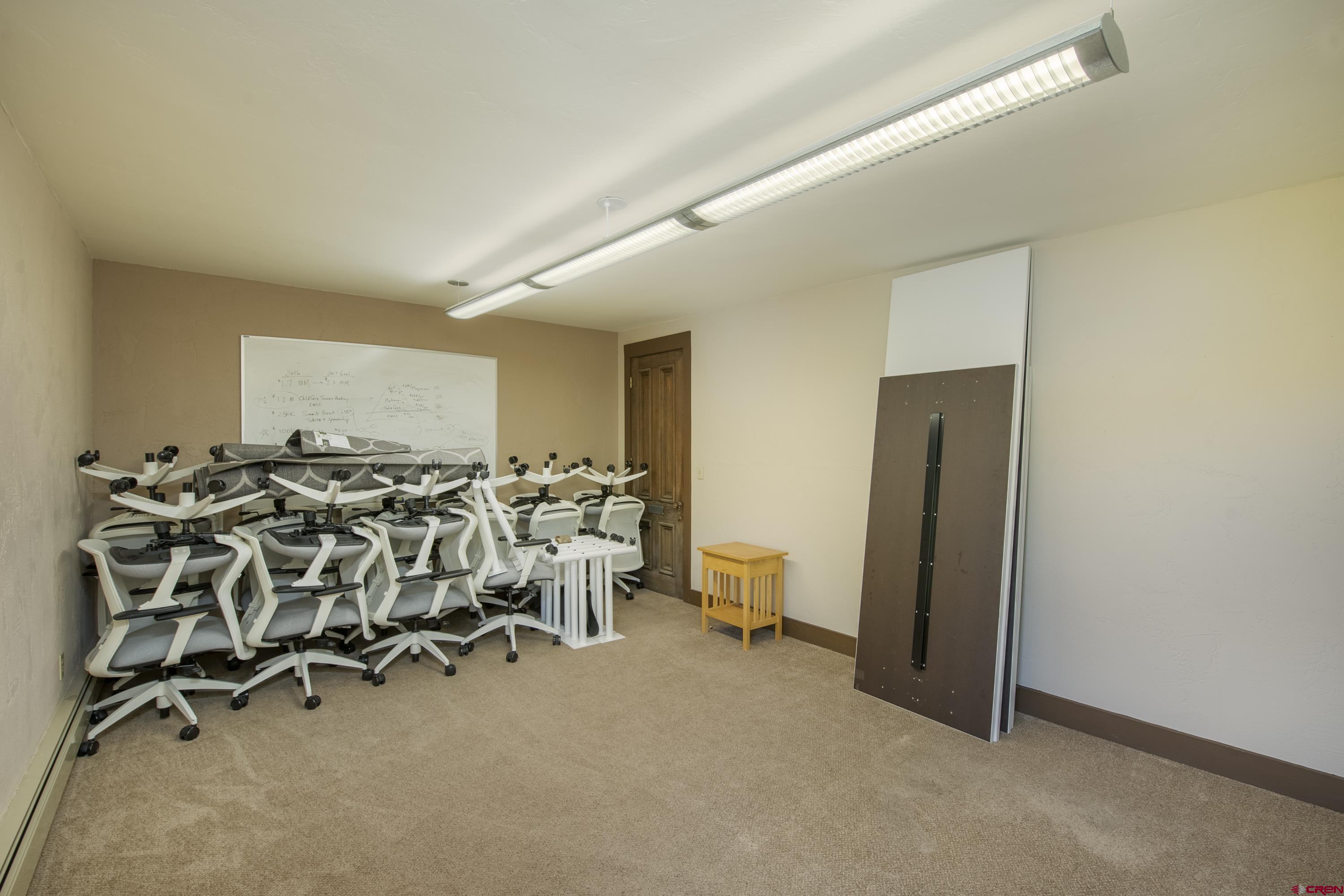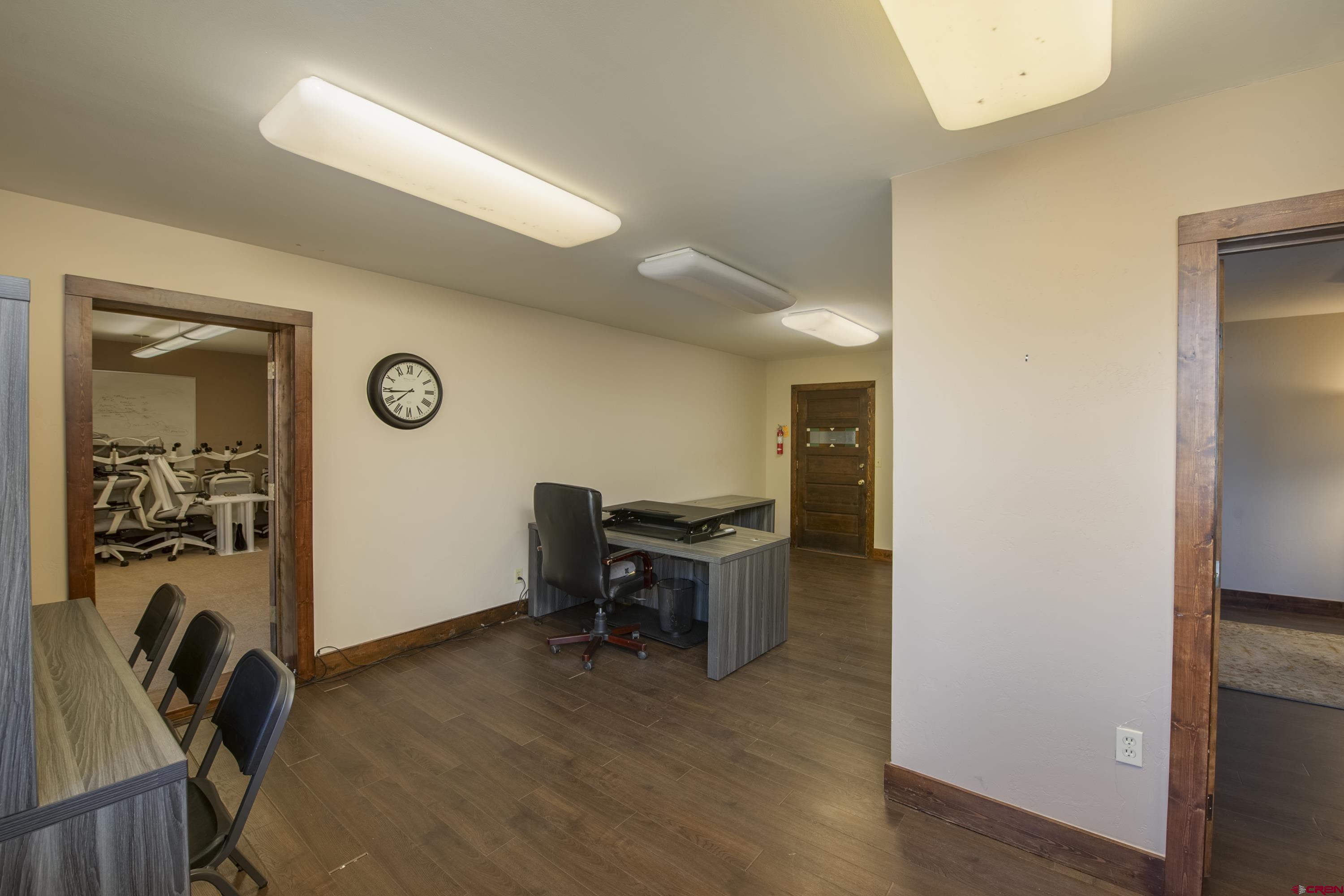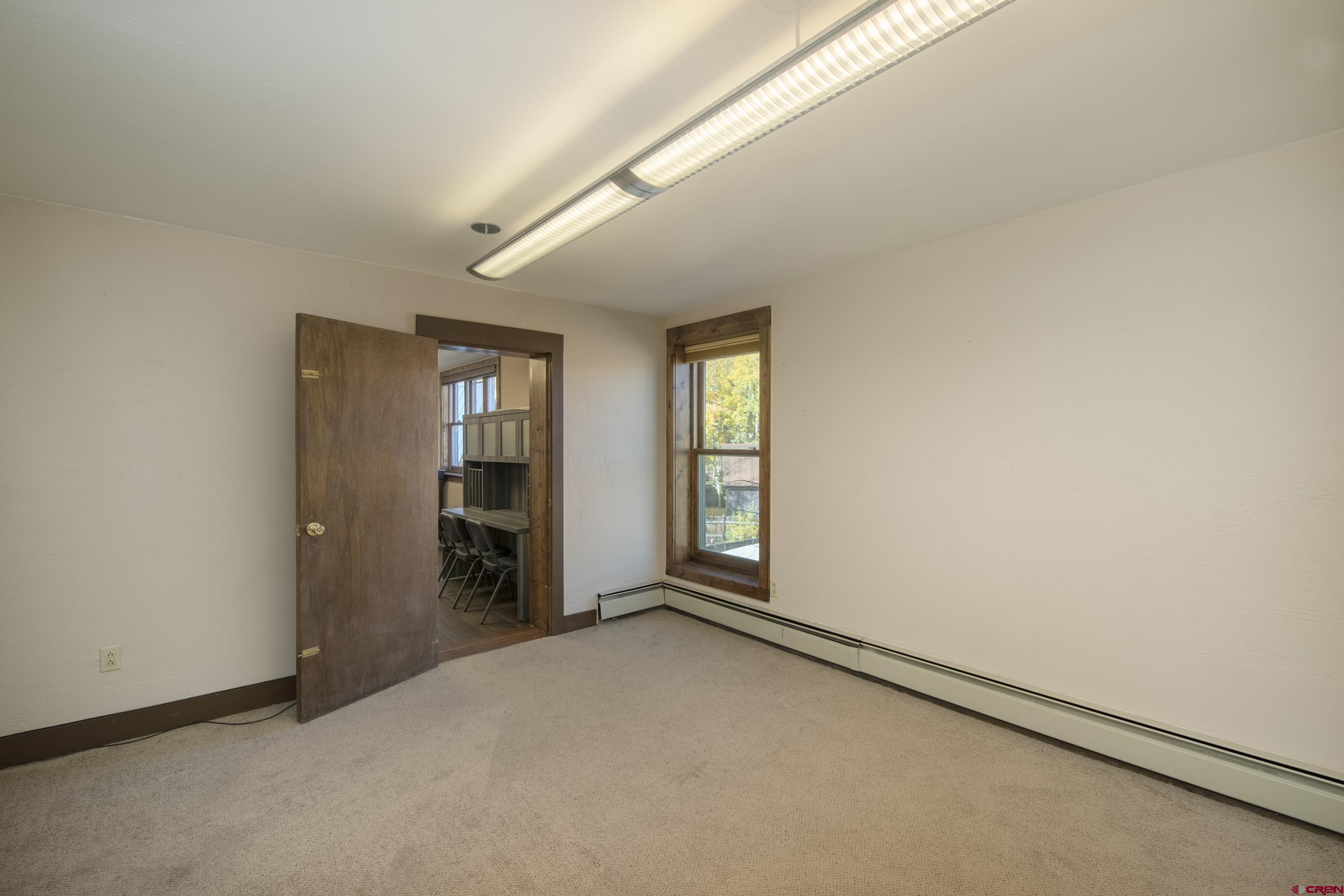 This commercial property features three units in the Bullion King building, located at the bustling 4-way intersection in downtown Crested Butte. With a total of 777 square feet of finished space, the units can be rented individually or combined for a larger office setup. Situated at the prime corner of 6th Street and Elk Avenue, the property offers convenient parking in a shared lot at the front. Access to the second-floor office is available via an interior staircase at the front of the building or an exterior staircase at the back. Shared restrooms is available on second floor. The office space is offered furnished with desks, chairs, and shelving.