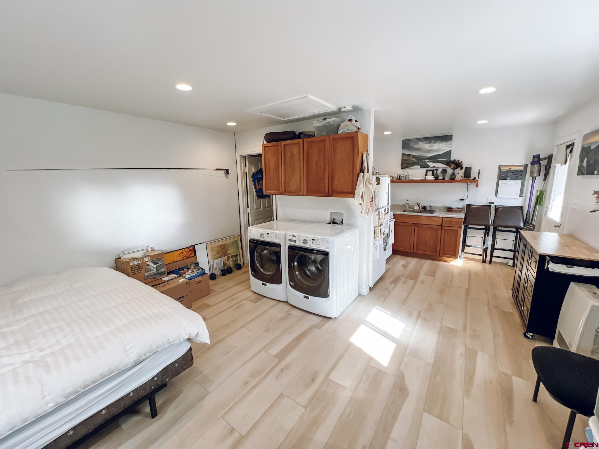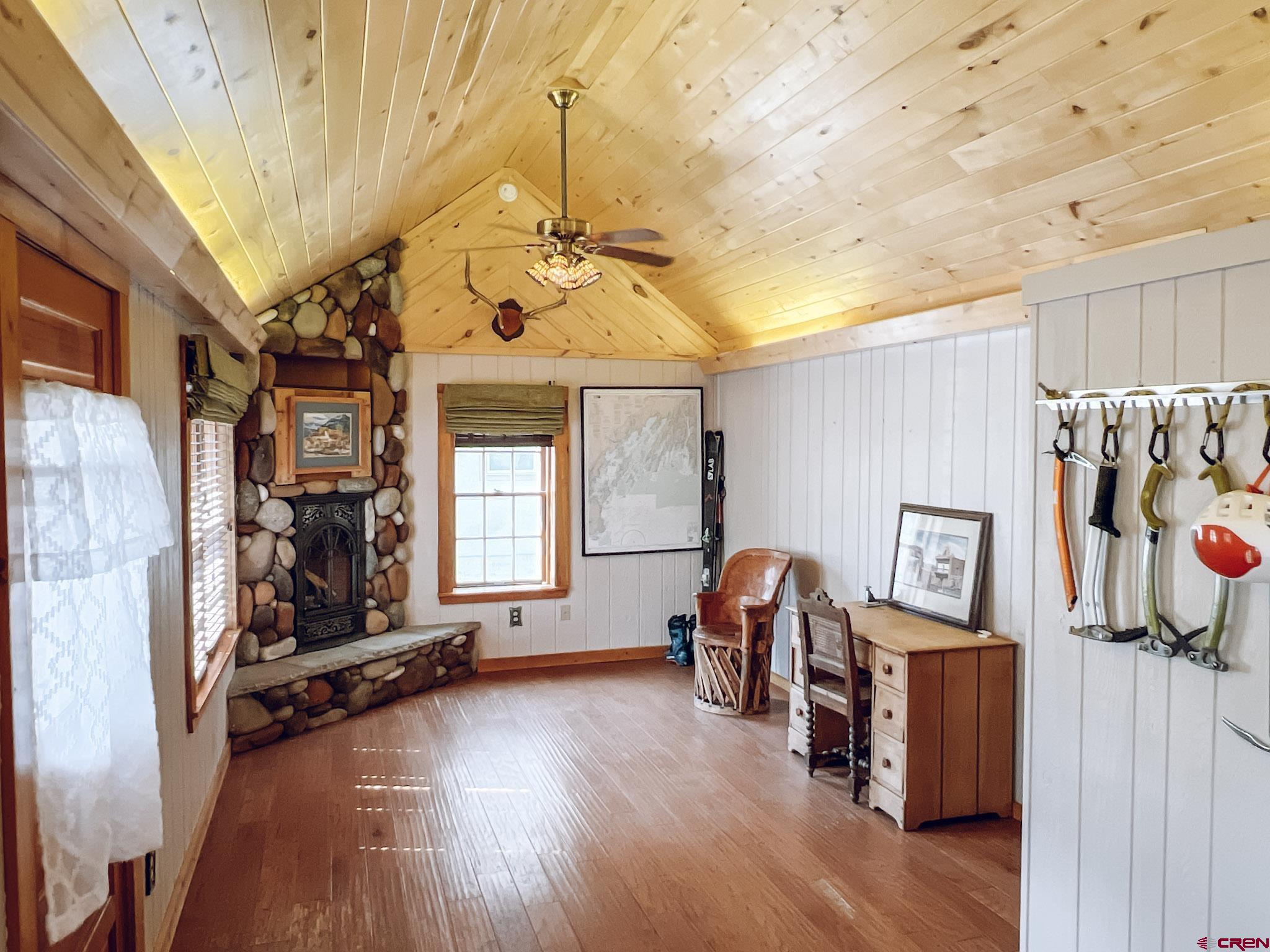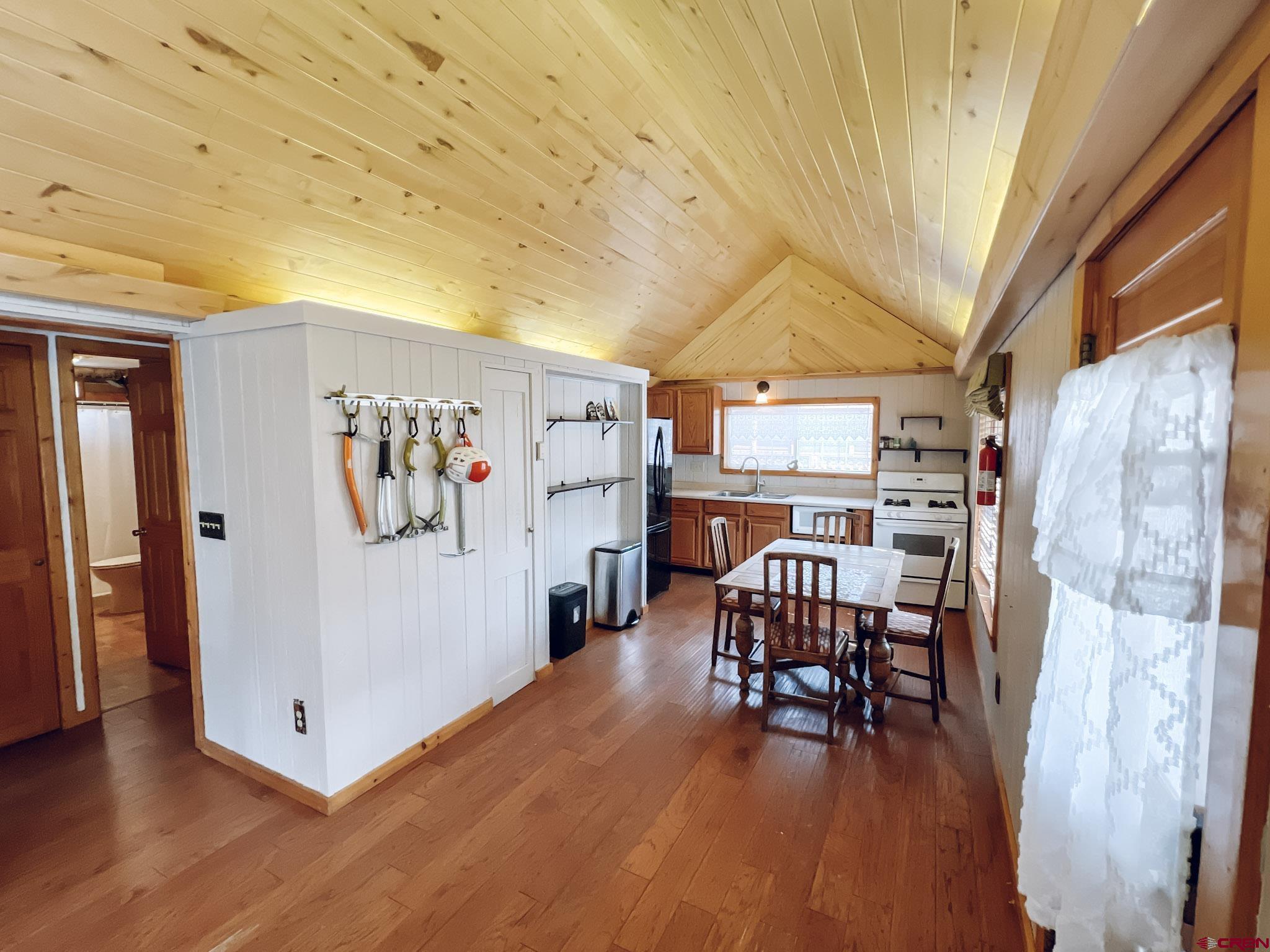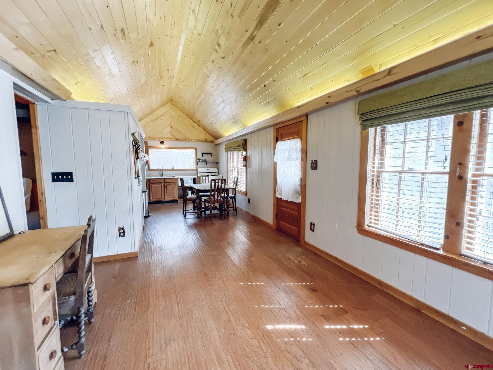 Charming mountain log cabin set on two town lots on Silver Street, just moments from Pete’s Lake and surrounded by beautiful mountain views. Originally built in 1945 and relocated to Lake City, the home was fully remodeled in 2001, blending historic character with modern comfort. The single-level main residence offers approximately 833 sq. ft. with 2 bedrooms and 1.5 baths, featuring vaulted tongue-and-groove ceilings, a mix of hardwood and carpet flooring, electric baseboard heat, and a cozy propane fireplace in the living room. Step outside to enjoy the partially covered front deck—perfect for taking in the scenic surroundings. Additional highlights include a detached oversized two-car garage built in 2021, along with a separate studio-style dwelling complete with a ¾ bath, efficient Rinnai heater, and in-unit washer and dryer—ideal for guests or rental potential. Conveniently located within walking distance to downtown Lake City, you’ll have easy access to local restaurants, shops, trails, the Lake Fork of the Gunnison River, grocery store, Mountaineer Movie Theatre, and the Lake City Community School. Zoned Limited Multi-Family, the property allows for short-term vacation rentals, making it a fantastic opportunity for both personal use and investment. Buyer to verify square footage.